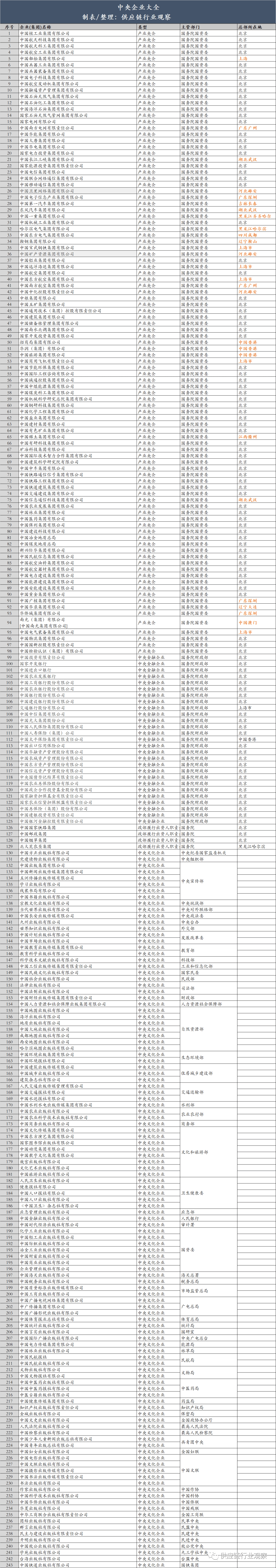 23-27为通信及电子信息央企,分别为:中国电信、中国联通、中国移动、中国卫星网络集团、中国电子信息产业集团;28-33为装备制造类央企,分别为:中国一汽、东风汽车、中国一重集团、中国机械工业集团、哈尔滨电气集团、中国东方电气集团;34-37为矿产资产类央企,分别为:鞍钢、中国宝武、中国矿产资源集团、中国铝业集团;