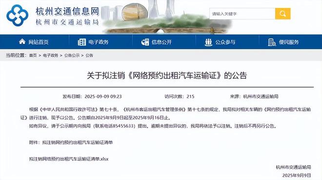 根据公告,此次拟注销的车辆清单已于2025年9月9日向社会公示,公示期至9月16日。清退依据主要为《中华人民共和国行政许可法》第七十条及《杭州市客运出租汽车管理条例》第十七条相关规定,涉及车辆多因达到报废标准、长期未运营或不符合继续从事网约车经营的技术与安全条件等原因。