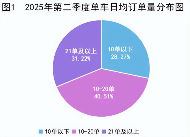 而在2025年第二季度,杭州市网约车单车日均订单量为16.02单,虽然同比有所增长,但环比下降3.63%。订单分布呈现严重分化:少于10单的车辆达2.55万辆,占比28.27%;10至20单的车辆有3.65万辆,占比40.51%;21单及以上的车辆仅2.81万辆,占比31.22%。这意味着近三分之一的车辆能获得较为充足的订单,而超过四分之一的车辆订单严重不足。