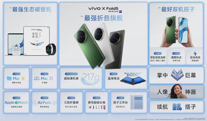 【vivo X Fold5折叠屏手机发布,首发第四代硅负极技术】6月25日,vivo发布新一代折叠旗舰手机vivo X Fold5。据介绍,vivo X Fold5行业首发第四代硅负极技术,搭载等效6000mAh蓝海电池与5000万像素蔡司超级长焦,配备IPX8、IPX9防水等级和IP5X级防尘,机身轻至217g,售价6999元起。(科创板日报)